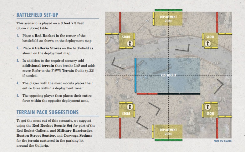 While the value proposition is high, the only potential catch is that Caught in the Crossfire is really best for players with a decent collection of miniatures and terrain. You don’t need tons of minis to play necessarily but players are encouraged to adjust their forces between scenarios as they would like. So this means you don’t want to try and play with only 4-5 minis for your chosen faction. Fortunately, you can use any two factions you want for this campaign so there is plenty of flexibility there. You will need plenty of terrain however. In fact, some scenarios call for specific pieces of terrain like the Red Rocket gas station as shown below. Terrain like this not only costs money and potentially time if you print it and paint it yourself, but they require some storage space too.