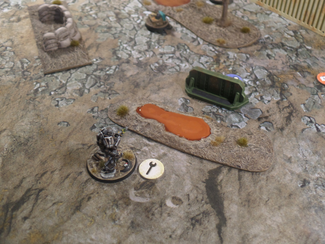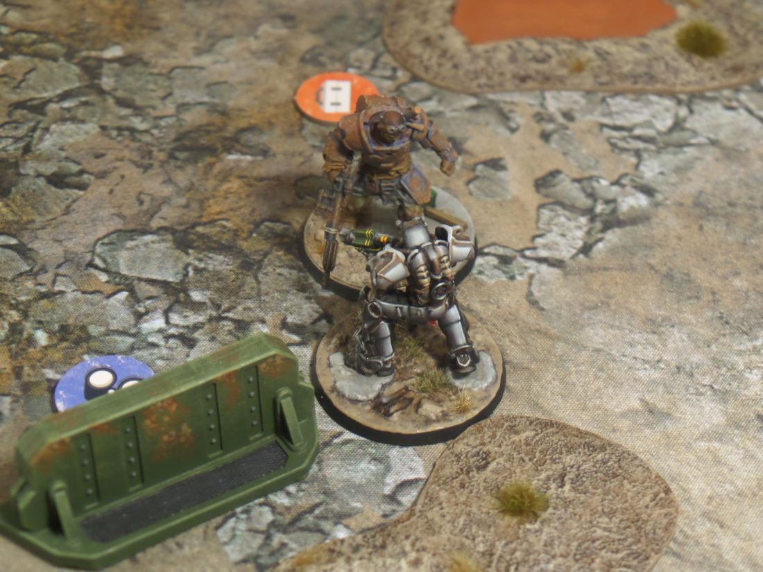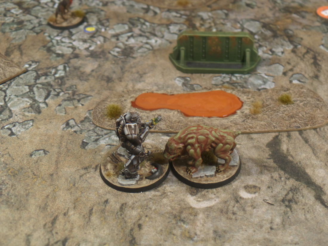 The Brute went next, sensing a chance to strike, and put a real dent in Jeff and Dogmeat. The Brute fired the missile launcher which caused a critical hit on Jeff and collateral damage to Dogmeat. Jeff’s companion took two wounds and Jeff took a single wound thanks to the superior protection of the power armor. Not great but it could have been worse.