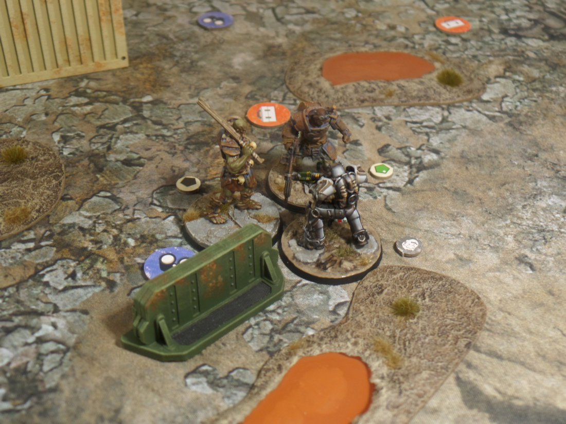 Sledge activated next to try and take a couple of swings at Jeff. The first attempt hit Jeff upside the head and did a point of damage which was only possible thanks to a bunch of favorable dice modifiers for the Super Mutants. The protection power armor offers is no joke! The second swing was completely saved by Jeffβs armor.