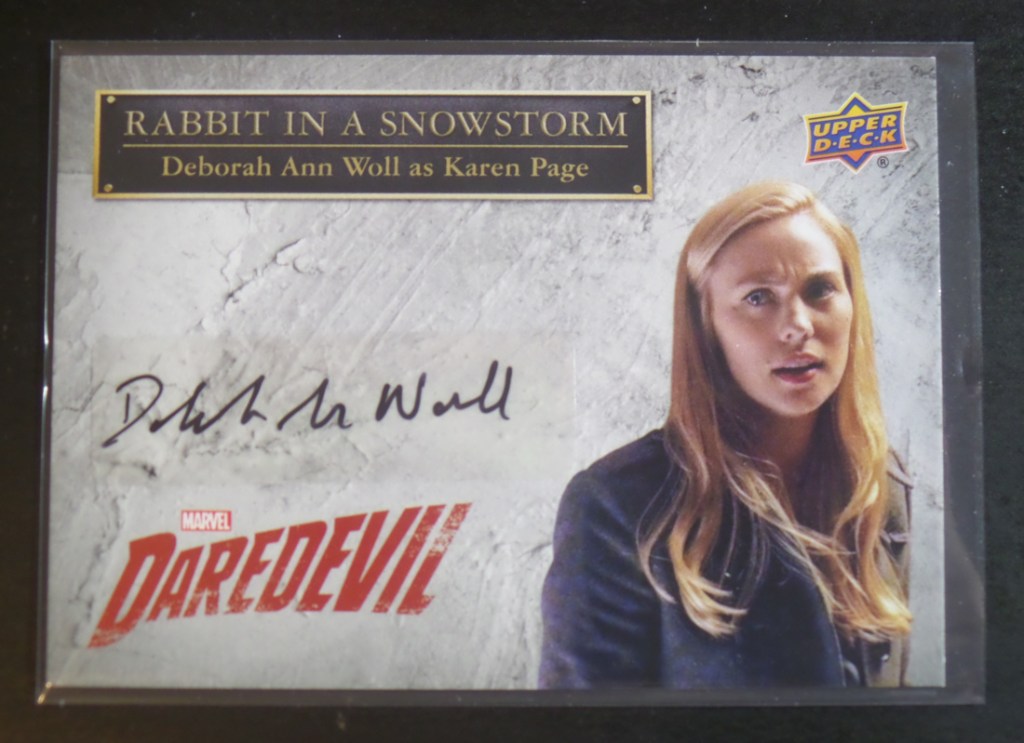 To cap off the Daredevil admiration, I thought I’d share a card from Upper Deck’s set that I’m proud to own. I bought a couple of boxes before the card market got crazy and got this fairly rare card. I don’t buy autograph cards a lot because they’re pretty pricey for the Marvel movies and so I feel very fortunately to have gotten Karen Page. Deborah Ann Woll is a bit of a board game fan in real life so that just makes her even cooler in my book. I also love that the background and the name of the cards come from something significant in the show. I should probably see if I can rub a couple of nickels together and get some more autograph cards from Daredevil because I have a hard time imagining that Daredevil will get a better TV or movie series than what Netflix created. In other words, I imagine the Daredevil show will be a favorite of mine for a long time to come.