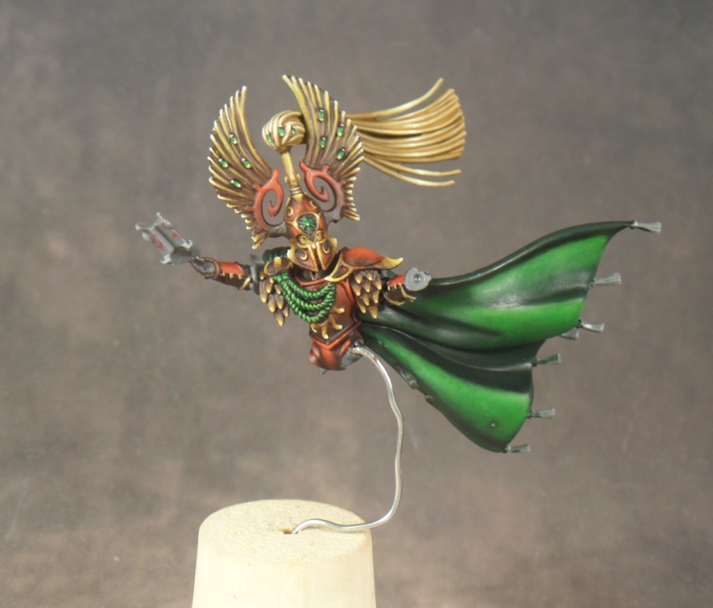 There were a lot of fine details to work on this week but I have to say that I’m generally ecstatic with how its looking. The armor looks so smooth and nice. The feathers look fantastic (other than a little touch up or two I see I need to make now. And thankfully, the cape which I’ve been working on the past couple of days looks nice too. I went with pure glazing which I don’t enjoy doing all that much. It requires time, patience, and repetition and that is something I’m not always able to give. One thing I will say is that painting capes in Warhammer is MUCH different than in LOTR. The capes in LOTR are way smaller and you need to use smooth layers to get them looking nice (which most painters can’t or don’t do as I think it is a specialized skill that is hard to learn). In Warhammer, you need to glaze capes to get things done right because the surfaces are larger and flatter than LOTR. Its funny how a different game or setting can require different skills like that.