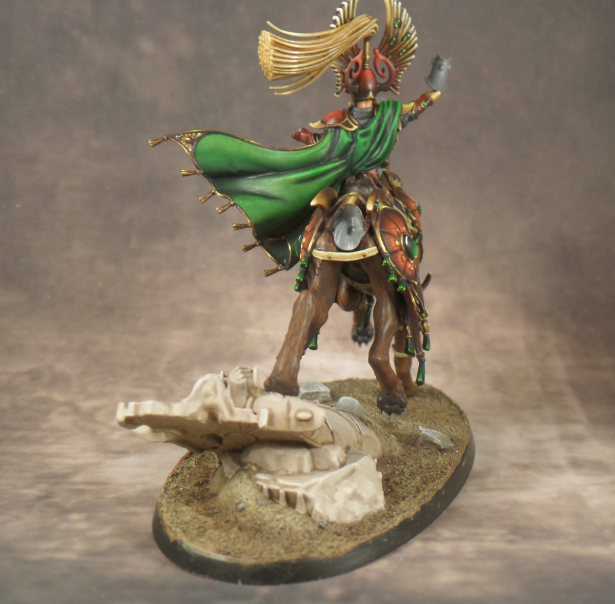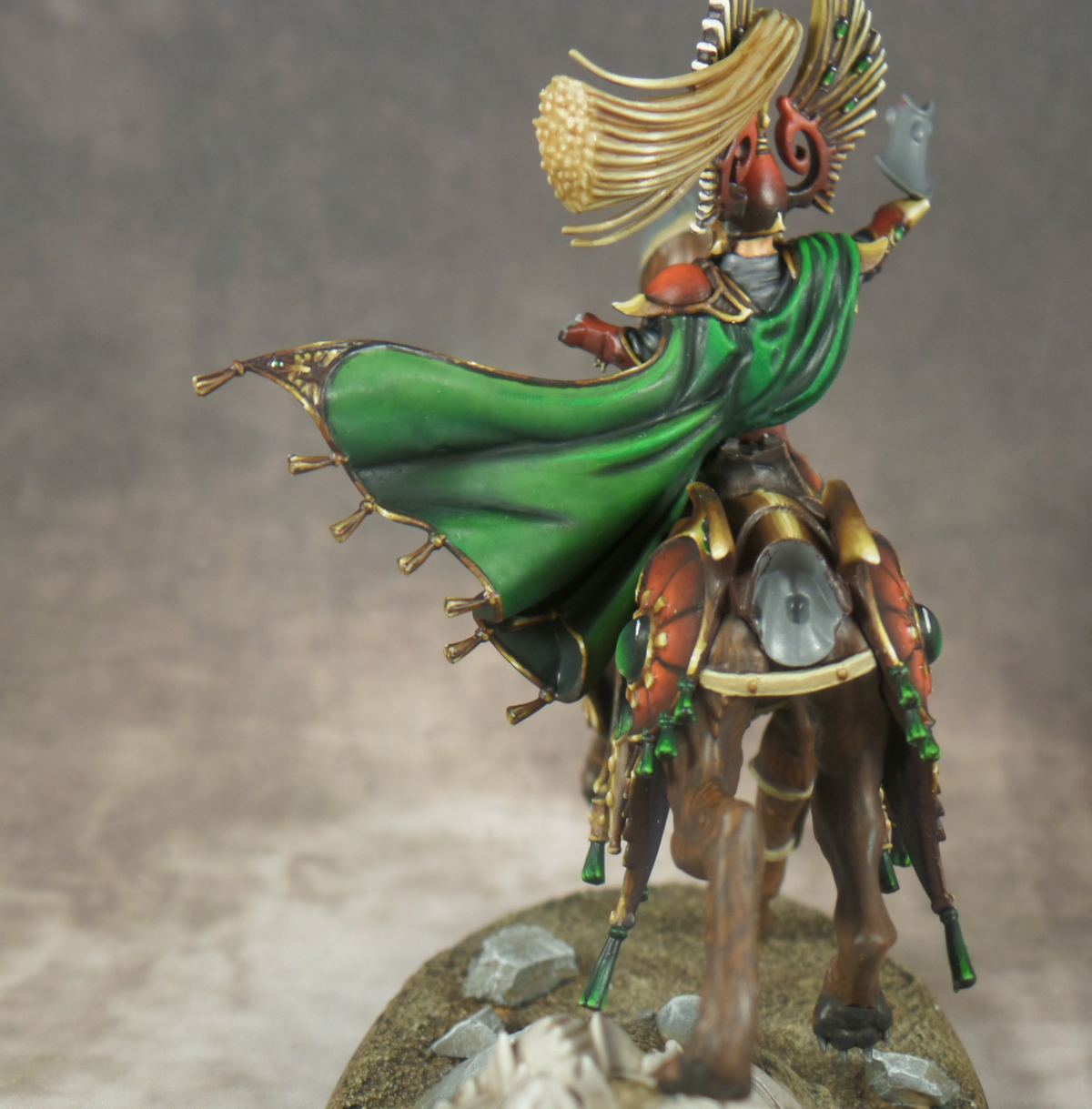 Its been an exciting and nerve-wracking week but ultimately I have some major progress to show off this time around. I somehow powered through painting the back of the Elf’s torso which was daunting because I had to glaze the other side of the cloak. Thankfully, the cloak didn’t take too long. I don’t know that the colors on the back perfectly match the front but I did the best I could in a reasonable amount of time (between 5-10 hours). After polishing off the rest of the details on the back, I thought, why not varnish this and get it on the elk? I was anxious to see how it would all fit together as I knew that this was going to be the most important and trickiest part of this model to assemble. So I somewhat foolishly went ahead and gave it a try!