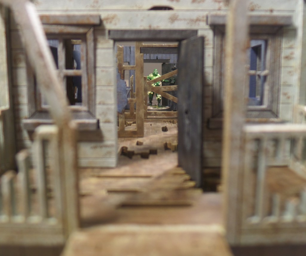 As you can see, I never finished the foundation for the house which makes it look quite a bit better and there are stairs on the front and back now too. The stairs don’t really attach to the house so I’ll be probably leave them loose and set them up whenever I play Fallout. One thing you’ll see is that a lot of the MDF tabs on the house are now covered fairly well thanks to a recommendation from Dave Stone. Wood filler really does the trick with MDF gaps and I will be using it in the future without a doubt, so thank you, Dave! Now, back to the cinematic shots!