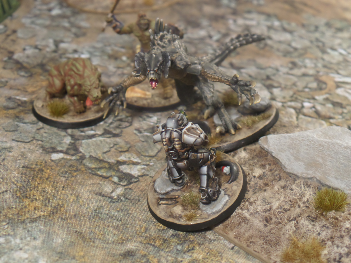 The unengaged hound charged Goddard and tried to rip into his power armor but the metal was too strong for its teeth.