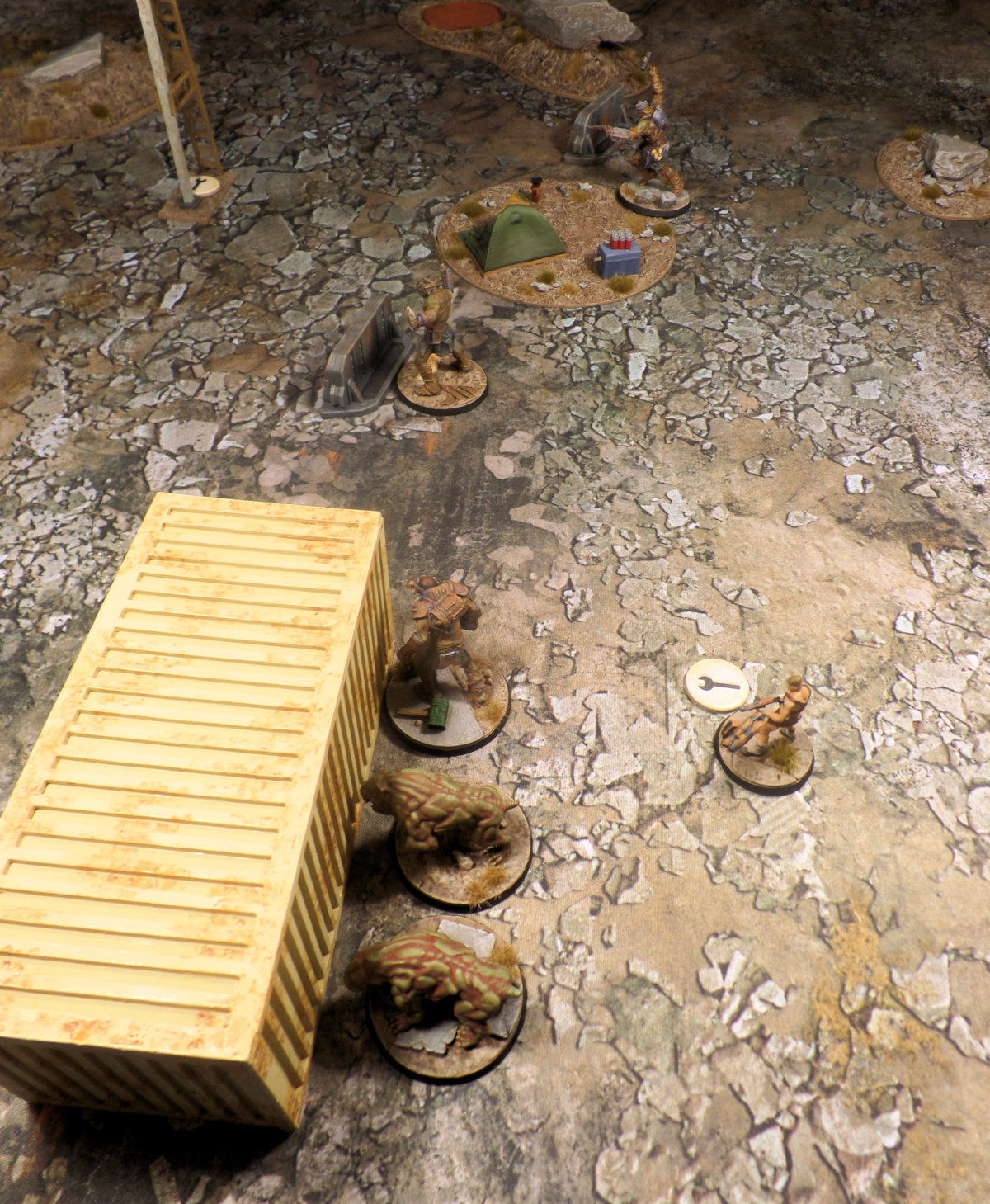 Round One – The Survivors and Mutants maneuvered around the battlefield with both sides electing to make use of cover and move away from where the Deathclaw enters the board. Many of the Survivors found shelter behind an old construction shed.