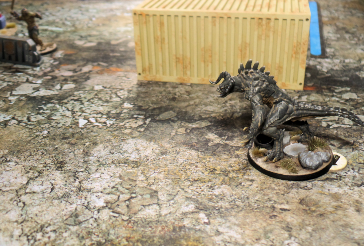 The Aviator and both Super Mutant Hounds activated with each one moving away from the shipping crate to put some distance between them and the Deathclaw.