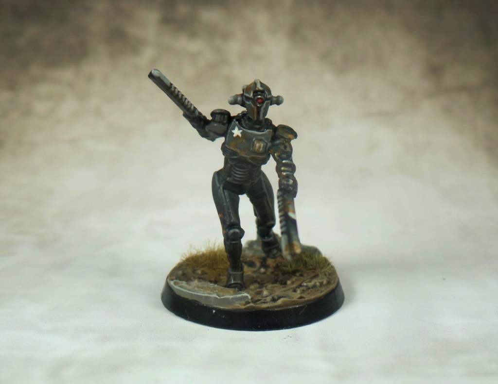 Another week, another Fallout-based pun. Fortunately, I have regained hobby momentum this week and so I have more to share than in the last couple of weeks. I had some time to fill so I started another Fallout mini. For whatever reason, its hard to find decent pictures of Assaultrons in Fallout 4. I could have sworn they have a greenish look to them but the pictures I saw looked more silver/metallic so that is what I went with. I did do a bit of freehand on the star and while it isn’t perfect, I think it looks decent enough considering how small the miniature is. This mini didn’t take too long to finish and I’ll be curious to see how it plays in-game as Assaultrons, while they don’t look like a little slight, are very dangerous in the video games. They’re fast, can take a lot of damage, and do a lot of damage. A deadly combination!