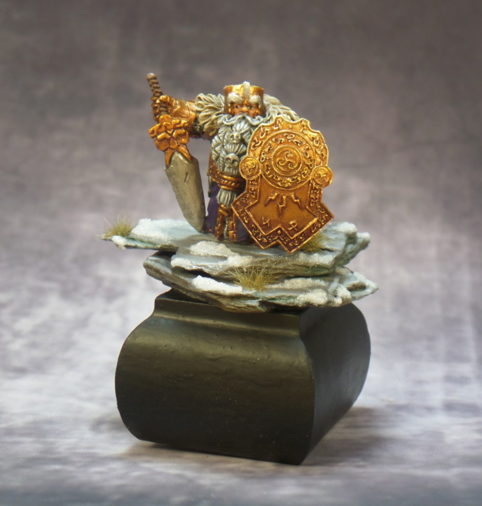 Compare how this base looks to a previous attempt at a dwarf on a mountainside in 2019. While the mini below doesn’t look bad by any means, the slate isn’t as realistic looking and the base is too flat. When all is said and done, I think the newer base will look like someone standing on the edge of a cliff or hill which is more what I intended in both pieces.