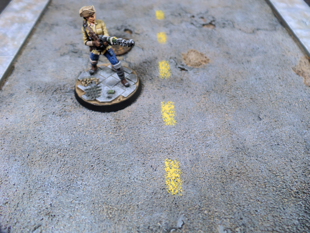 I’m excited to be working on this terrain because one of the things I really need are some roads to bring Fallout to life. The Black Site Studio roads took a long time to be made and delivered but I think they meet my high standards for terrain nicely. The system is modular so I can do curved roads and three and four way intersections as well. I only have straight pieces to work on currently but I will almost definitely get more to increase my table layout options. My only concern, if I have one, is that you can’t easily have beveled or scenic edges to the street which makes these best suited to represent city streets and not a county road. I’d love to have the best of both worlds but if I can only do city streets well of the two, I’ll take it. While I didn’t take pictures of it, another thing I like about this terrain is that each piece has little pegs underneath so you can fasten them together seamlessly and they won’t move around much during games which is a nice touch. Here is one last close up photo with the only painted Fallout mini I had at hand this evening. I’m sure I’ll be using these more for scenic pictures in the future, let alone, in battle reports.