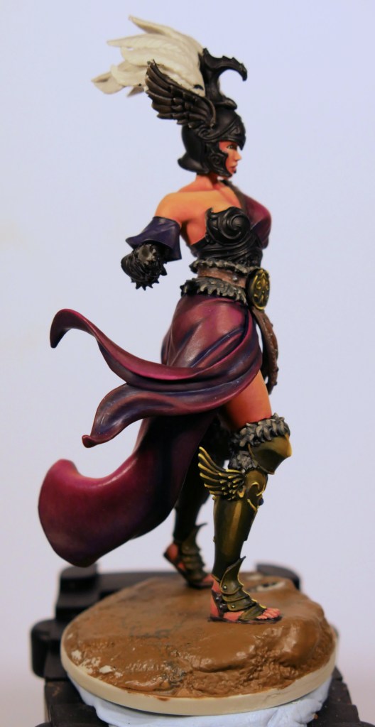 Unlike last time, I think these pictures came out fairly nicely. The colors might be slightly over saturated so the pinks in her skin are a bit too strong but that’s not a huge deal. I will say that I love the etchings on the armor. While its hard to get the blends completely smooth compared to a flat surface and some of what I did is not perfect in that regard, I still really enjoy painting etching and edges on armor like Minerva has. I feel like that’s a place where I can really let my skills and attention to detail shine. I’m excited to keep making progress on her and I think she’s going to be an impressive miniature when finished.