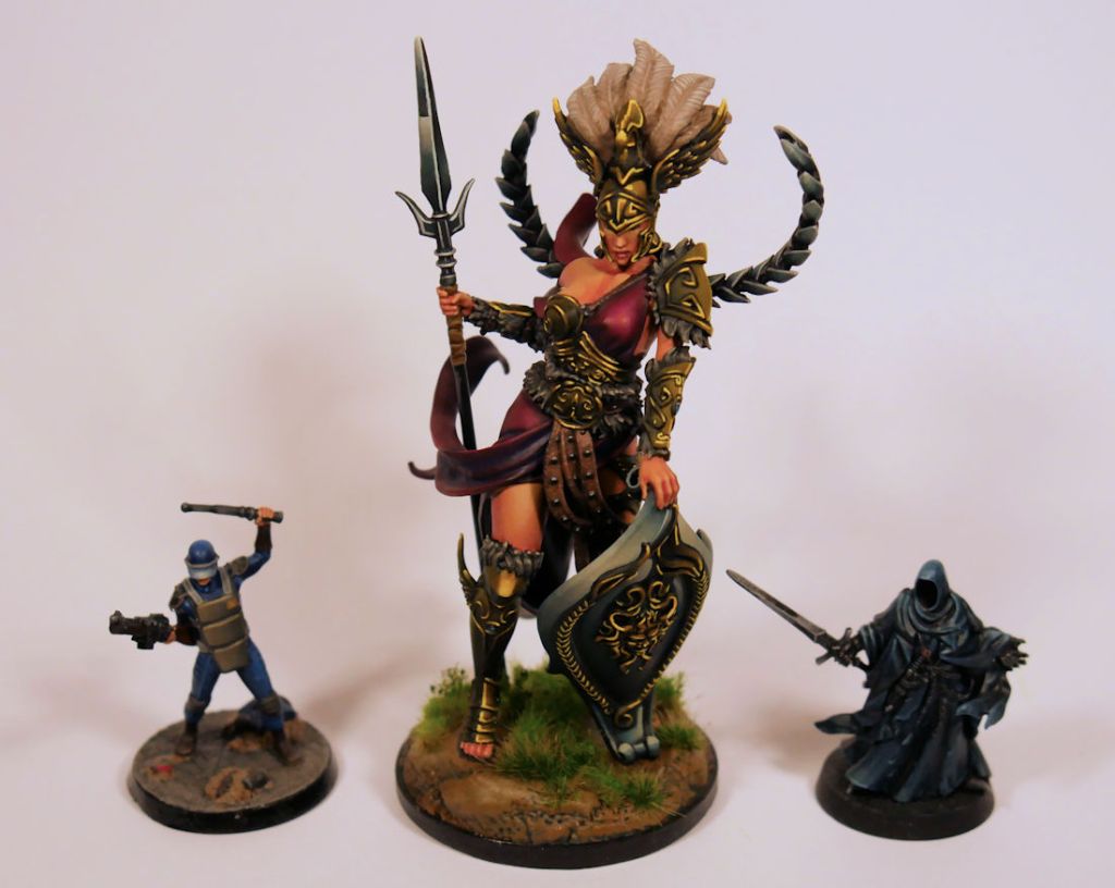 So there she is! Its hard to judge these things because whatever you just finished feels like the best thing you’ve ever done but I am most proud of her because she’s probably the most impressive looking thing I’ve painted yet. Her size is a big reason for that but she’s just full of details. A visual feast for the eyes, if you will. I really like that she’s big enough that I can see her across the room and she draws my attention. Most of the Warhammer and MESBG display minis I’ve painted can’t do this because they’re too small. Its funny because when you start this hobby as a gamer, you think the scale for gaming miniatures is normal but if you’re interested in display painting, I’m finding that bigger is better and there’s no reason we have to paint tiny miniatures that can only be appreciated from a 6-12 inches away. Speaking of which, here’s a size comparison of Minerva with some other display projects and some gaming miniatures I had on hand.