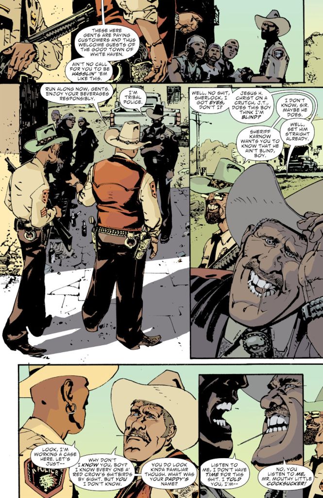 One of the things that I find fascinating about Scalped is that it is almost like a noir location, instead of a story that is in the noir genre. In your typical noir story, an anti-hero, who is quite frequently a private investigator or criminal is the main focus. The plot revolves around them, and sure, there is usually a femme fatale, among other characters, but the focus is entirely on the anti-hero. In Scalped, nearly every character is affected by the setting, which is a Native American reservation and it brings about the downfall of quite a lot of characters along the way. I’ll talk more about a character who demonstrates what I’m talking about in a sec.
