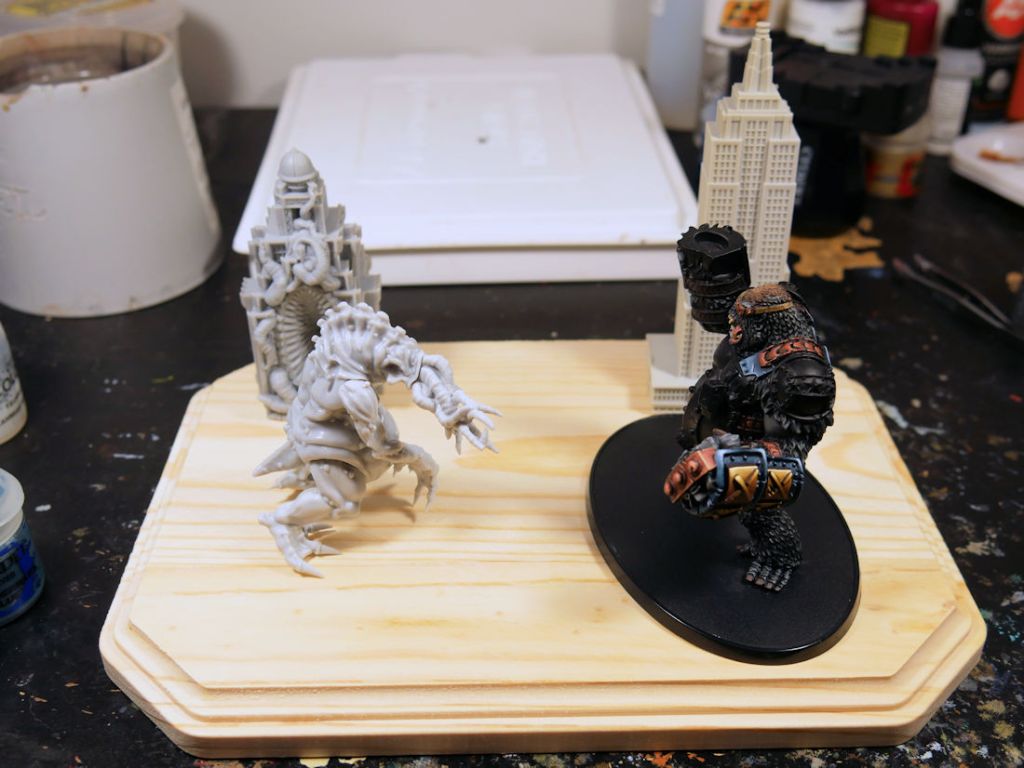 2. Excellent progress on Hondo Jeff, the additional color on the forehead brings focus on the face, and adds an area of interest as well. Shame about the Kaiju, although the loss of a claw could be painted as fight damage, which would add another level to the scene, without them having to make contact. See what you mean about the base size, and how you wont be able to fit many buildings in let alone streets, hopefully you can source a larger one.