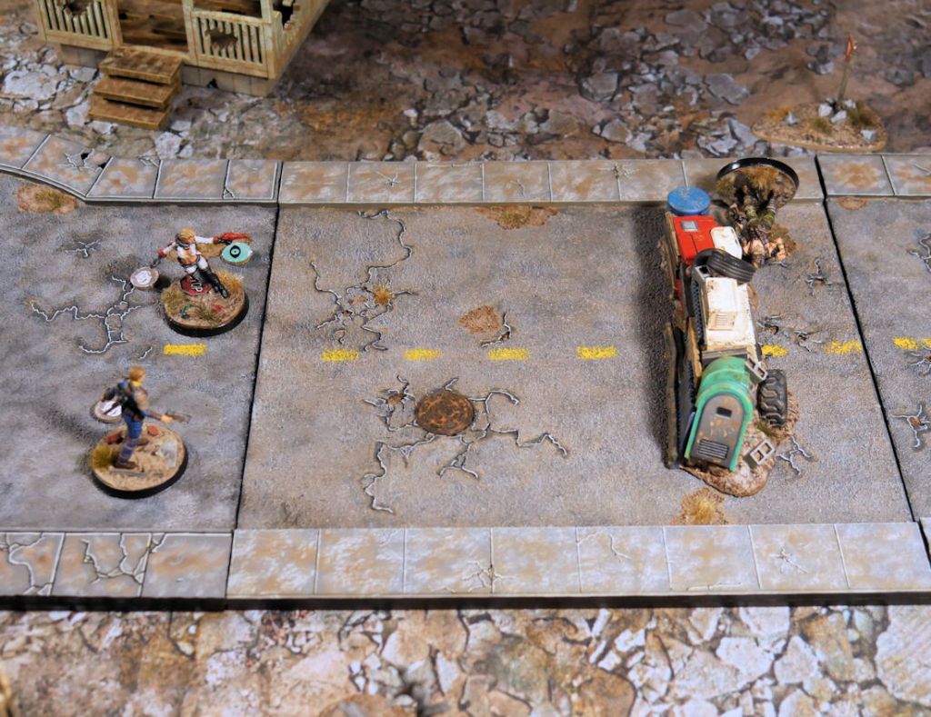 The Whiskey Bob moves up and manages to hit Nuka Girl for two damage. Elvis, the Scavver, also advances but fires at Jeff for his final action. Jeff is hit but takes no wounds thanks to cover and the Survivors’ armor bonus. Whiskey Don aims for Jeff and misses to close out the round.