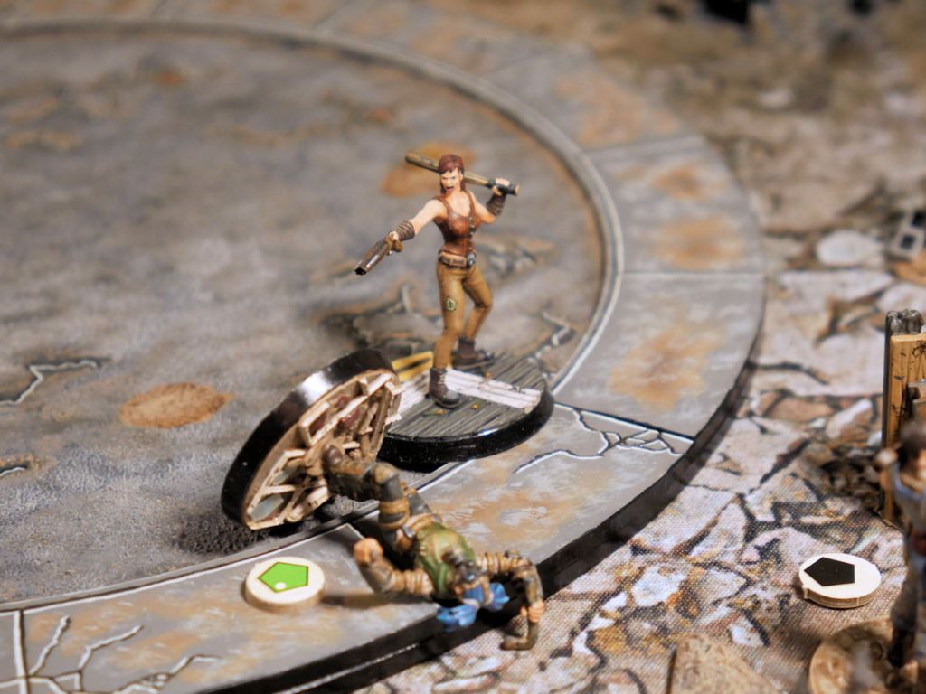 Sensing an opportunity on the other side of the table, Whiskey Bob fired his rifle and hit Nuka Girl once for three damage which she could not dodge with her special rule Acrobatic (which lets you prevent all incoming damage once per game, if you can pass an agility test) or her armor.