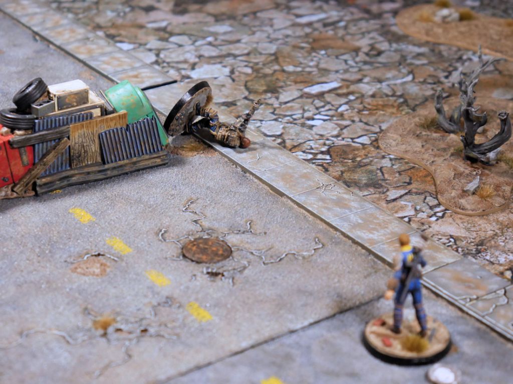 Smiley broke away from close combat with Sturges, who failed to hit her in response. She then had a choice of shooting Jeff in the back which would help the Raiders win or killing Cait. It took two shots but the Combat Zone veteran could take no more! Smiley then took three wounds off Jeff. The Survivors were struggling to deal with Smiley’s power armor and minigun combo.