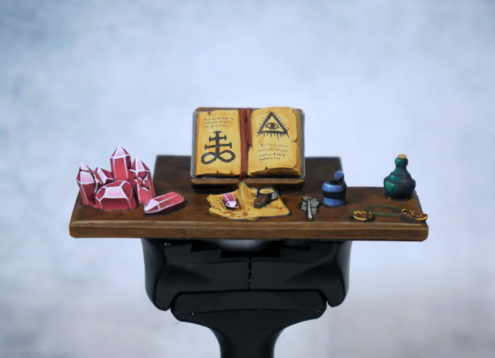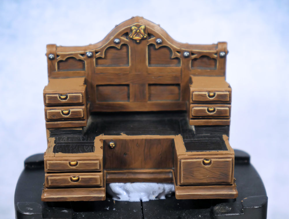 I also have been working on the desk itself which is looking better. I still need to work on the sides and back. Once I get a bit further, I can add the piece pictured above onto the desk and you’ll start to see everything coming together at that point. There’s another flat piece that goes on top to be painted as well so there’s still a ways to go on this piece of terrain.